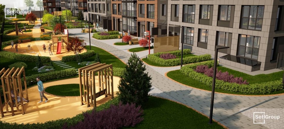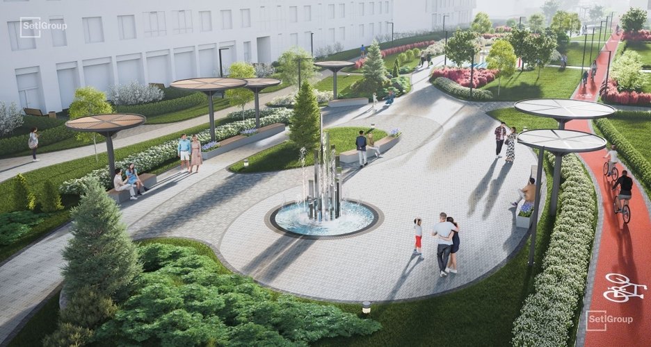 Центром притяжения квартала станет благоустроенный променад протяженностью более 1 км, а со стороны Большого Смоленского проспекта появятся две благоустроенные площади. Пространство украсит эффектный гейзерный фонтан, декоративные кустарники, малые архитектурные формы, а вдоль пешеходного бульвара расположатся общественные пространства с продуманным зонированием и различным наполнением: качели и уютные зоны отдыха для взрослых, детские и спортивные площадки, велодорожка с противоударным покрытием.