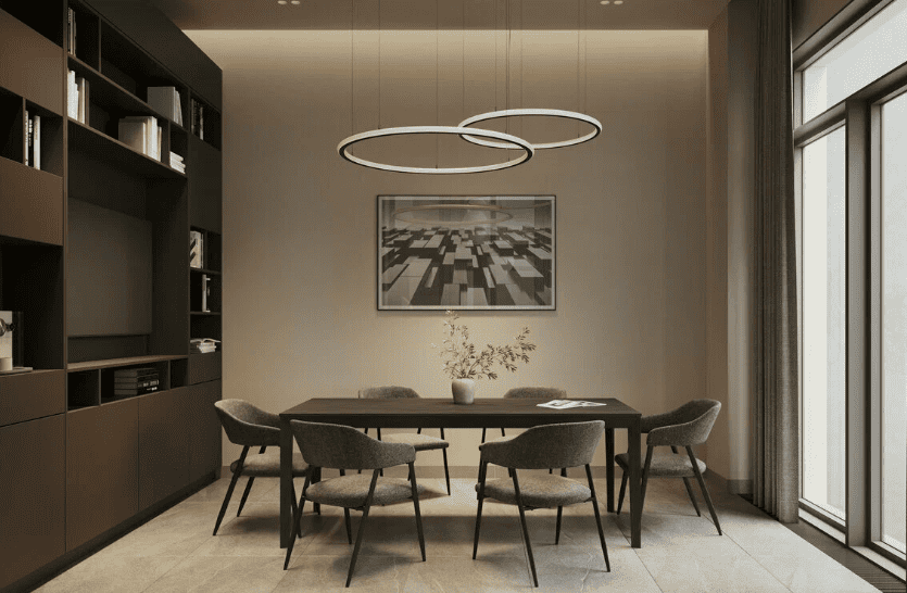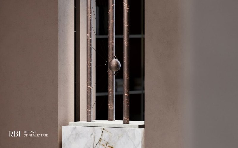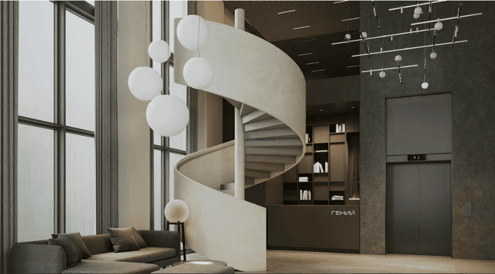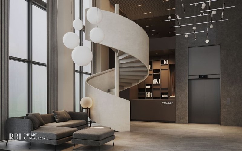 Ядро дизайн-кода дома - центральные парадные с высокими потолками, панорамными окнами и элегантным интерьером, который соотносится с авангардистской архитектурой проекта. Здесь вы найдёте отсылки к советскому кабинетному шику 70-х годов XX века и артефакты из лаборатории гениального учёного.