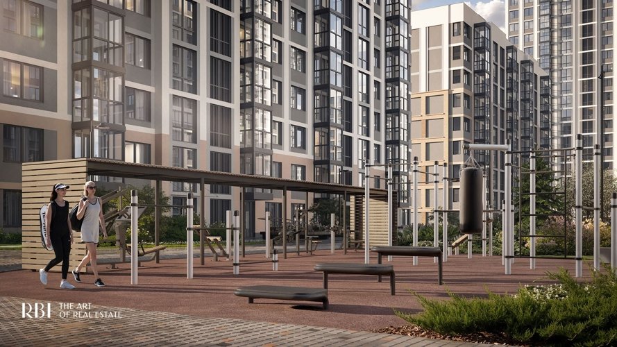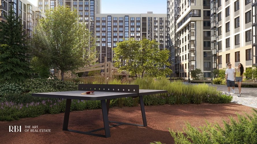 Физику тела вы можете прокачать, не покупая абонемент в фитнес-зал. Во дворе дома есть спортивная площадка с профессиональными силовыми тренажёрами и workout-комплексом. А для любителей командных игр - настольный теннис.