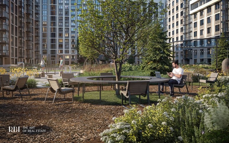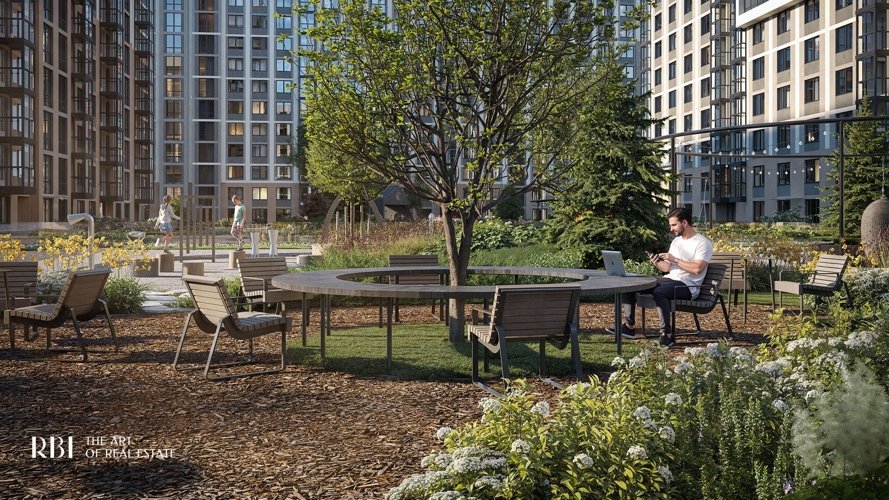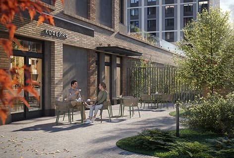 Если вы часто работаете дома, для вас есть креативные пространства как под открытым небом, так и в закрытых парадных. Из коворкинга во дворе открывается вид на детскую площадку, что удобно для работающих родителей.