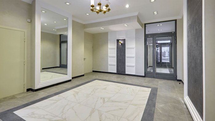 Дизайн холлов продолжает архитектурную тему фасадов — прямые линии, классически сдержанная палитра оттенков натуральных отделочных материалов. Дизайнерские светильники и декоративная подсветка.