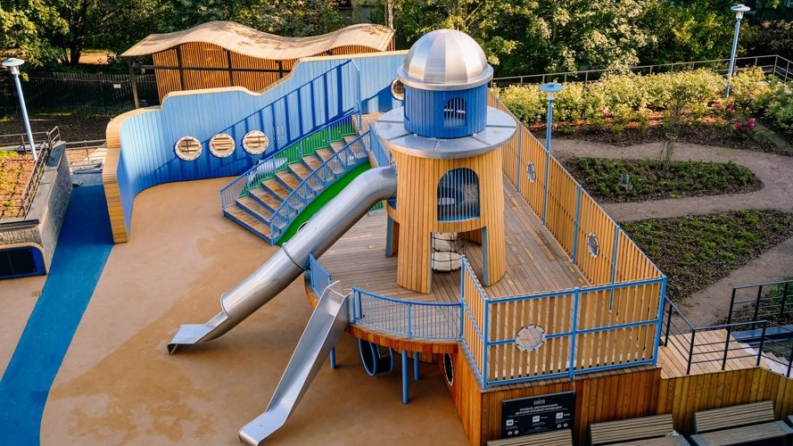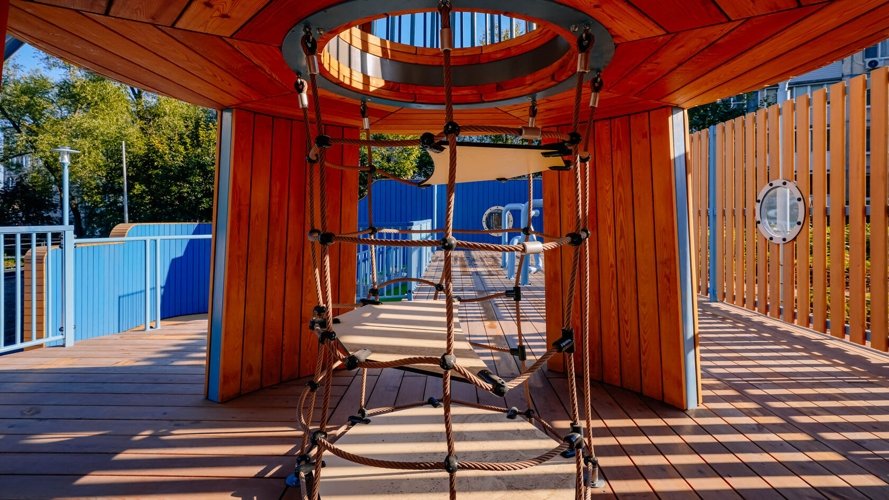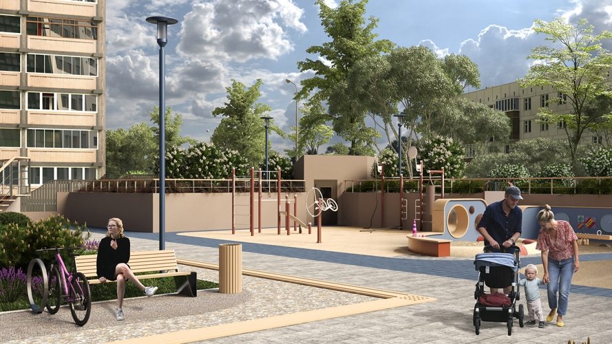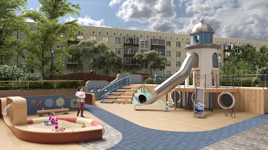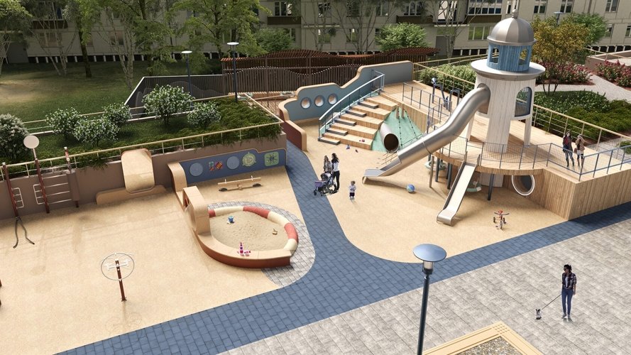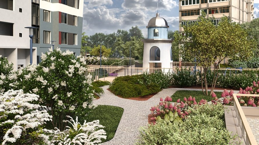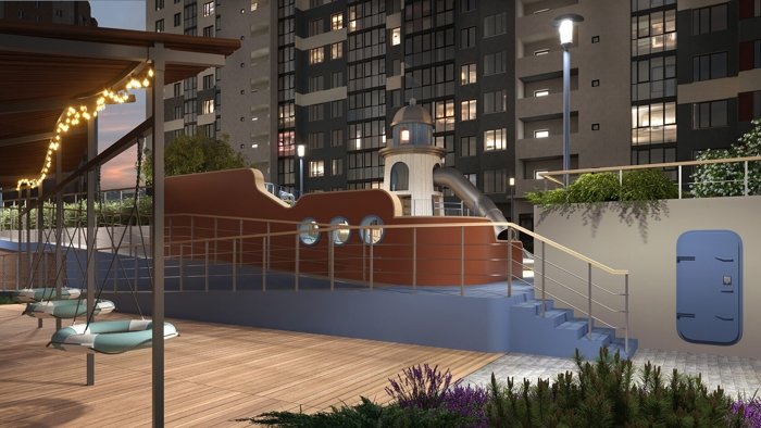 В основе дизайна дворов лежит продолжение морской тематики: красота и увлекательность круизного отдыха во дворе собственного дома. В разноуровневом пространстве акцентами выделены зоны отдыха, игр и спорта, озеленения, где каждый найдет для себя любимое место. Ландшафтный дизайн поддерживает общую концепцию комплекса и дополняет его архитектуру, а маяк в центре двора станет доминантой и точкой притяжения для увлекательных детских игр.